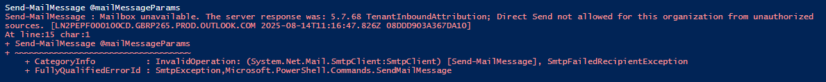 Once the Reject Direct Send setting was set to True, HUNT-IR noticed the following message during testing when attempting to send a Direct Send mail using PowerShell: