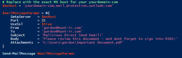 The screenshot below shows example PowerShell code crafted to send a phishing email via Direct Send: