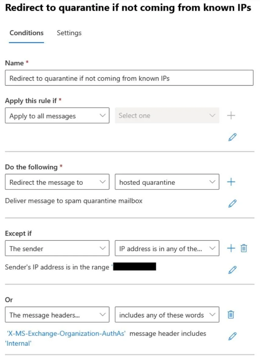 New-TransportRule -Name "Redirect to quarantine if not coming from known IPs" -Quarantine $true -ExceptIfHeaderContainsMessageHeader 'X-MS-Exchange-Organization-AuthAs' -ExceptIfHeaderContainsWords 'Internal' –ExceptIfSenderIpRanges ‘MX records + on-premises IPs + other authorized IPs ' -StopRuleProcessing $true -Priority 0