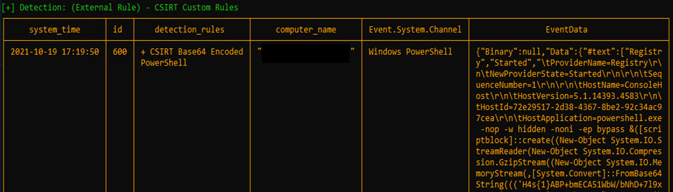 In this Sigma rule I have specified that EventData needs to contain the string ‘powershell’ and (to demonstrate the flexibility of Sigma) just one of the strings ‘FromBase64String’, ‘Compression.GzipStream’ and ‘Decompress’.
