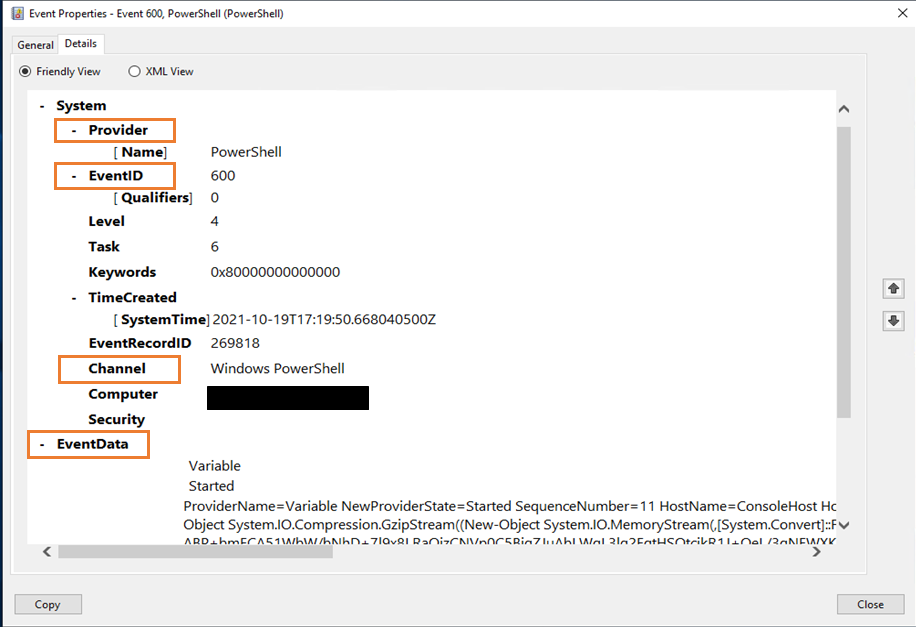 In this mapping file example, I have added that I want Chainsaw to hunt in the Event Data of PowerShell logs with the Event IDs 400 and 600. I have also specified that the System Channel (log name) be added as a table header when output.