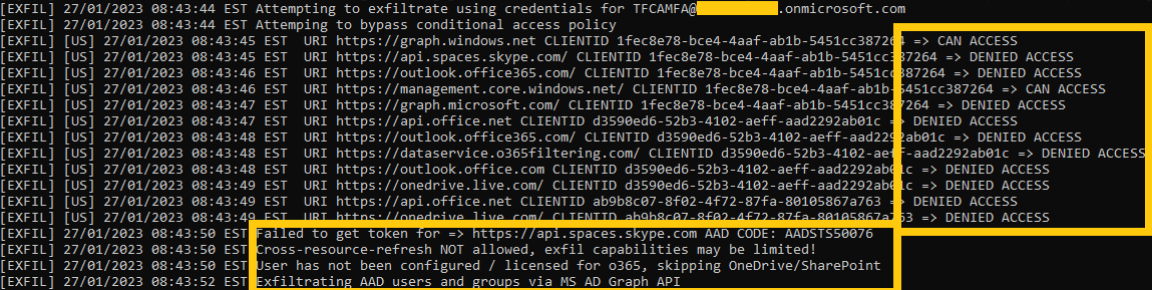 In my testing, so long as the Conditional Access Policy was configured to require MFA for 'All cloud apps', TeamFiltration was unable to bypass it. When executed with a correct username and password combination for the user, TeamFiltration produced an output indicating it was unable to access anything, also giving the friendly notice: