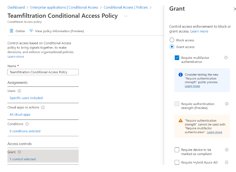 TeamFiltration's MFA bypass capability hinges on its ability to acquire valid access tokens or credentials and then subsequently use them to access parts of an Azure AD tenant not protected by MFA. There are also multiple ways in which MFA can be applied in an Azure AD tenant, so I set out to demystify how implementation of MFA can differ and which implementations of MFA could sufficiently protect against TeamFiltration and which could not. The summary of my experimentation is below: