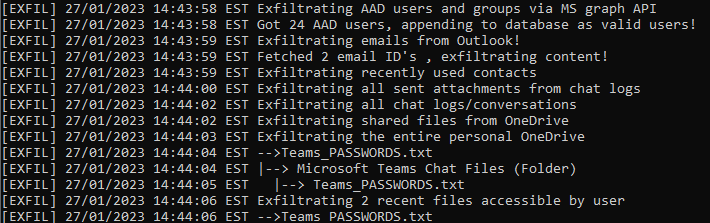 With a set of valid credentials, TeamFiltration is capable of exfiltrating all data available via the Teams, Outlook, OneDrive and Graph APIs.